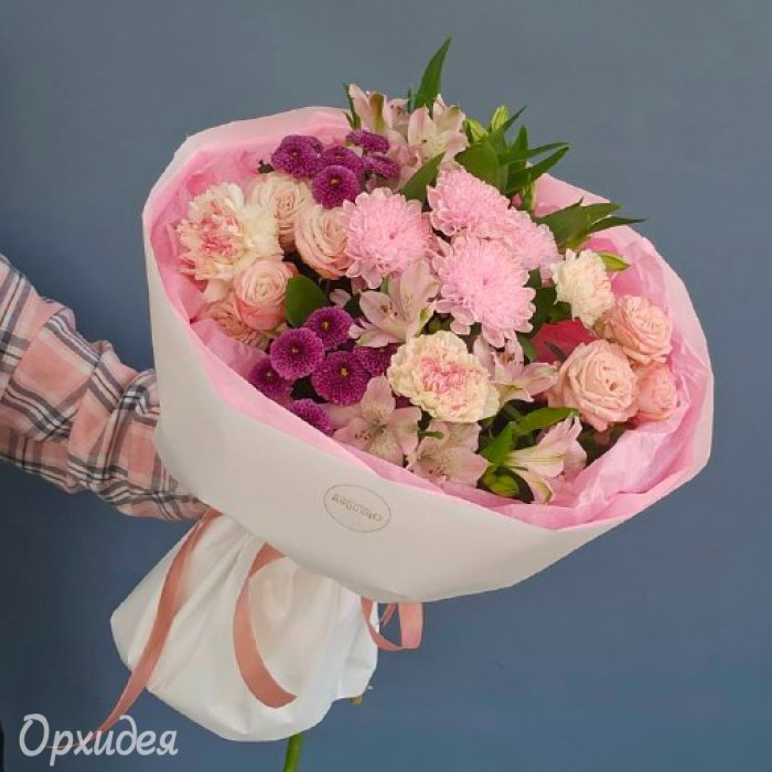 Каждая изготавливаемая флористом цветочная композиция является уникальной и может отличаться внешним видом, размером и оттенками цвета. Также возможны замены по ассортименту и составу цветов в зависимости от сезонности, наличия цветов и т.п. факторов. Итоговое исполнение заказа может незначительно отличаться от иллюстрации на сайте. При этом каждая цветочная композиция составляется из свежих цветов, и флористы предпринимают все усилия для того, чтобы цвет, форма цветочной работы как можно полнее соответствовали иллюстрации на сайте.