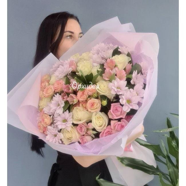 Каждая изготавливаемая флористом цветочная композиция является уникальной и может отличаться внешним видом, размером и оттенками цвета. Также возможны замены по ассортименту и составу цветов в зависимости от сезонности, наличия цветов и т.п. факторов. Итоговое исполнение заказа может незначительно отличаться от иллюстрации на сайте. При этом каждая цветочная композиция составляется из свежих цветов, и флористы предпринимают все усилия для того, чтобы цвет, форма цветочной работы как можно полнее соответствовали иллюстрации на сайте.