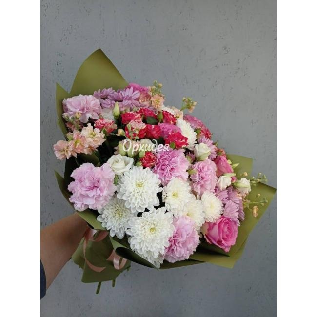 Каждая изготавливаемая флористом цветочная композиция является уникальной и может отличаться внешним видом, размером и оттенками цвета. Также возможны замены по ассортименту и составу цветов в зависимости от сезонности, наличия цветов и т.п. факторов. Итоговое исполнение заказа может незначительно отличаться от иллюстрации на сайте. При этом каждая цветочная композиция составляется из свежих цветов, и флористы предпринимают все усилия для того, чтобы цвет, форма цветочной работы как можно полнее соответствовали иллюстрации на сайте.