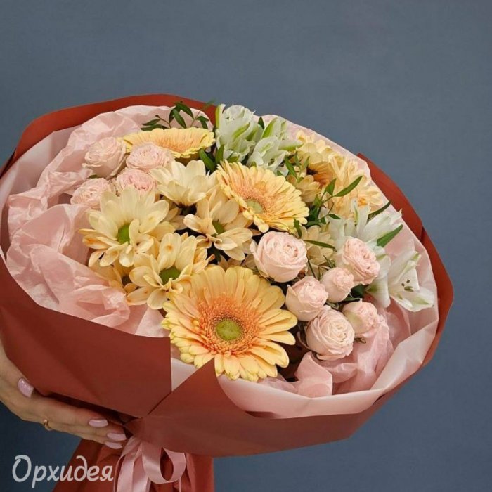 Каждая изготавливаемая флористом цветочная композиция является уникальной и может отличаться внешним видом, размером и оттенками цвета. Также возможны замены по ассортименту и составу цветов в зависимости от сезонности, наличия цветов и т.п. факторов. Итоговое исполнение заказа может незначительно отличаться от иллюстрации на сайте. При этом каждая цветочная композиция составляется из свежих цветов, и флористы предпринимают все усилия для того, чтобы цвет, форма цветочной работы как можно полнее соответствовали иллюстрации на сайте.