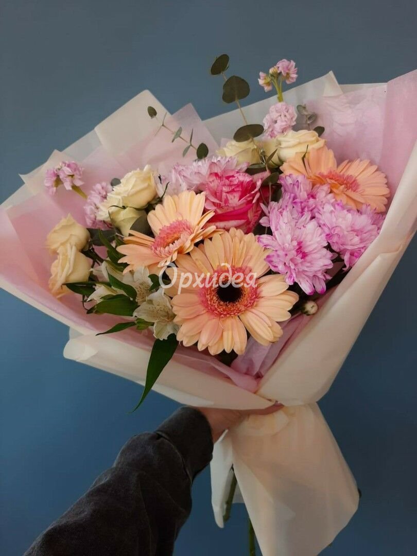 Каждая изготавливаемая флористом цветочная композиция является уникальной и может отличаться внешним видом, размером и оттенками цвета. Также возможны замены по ассортименту и составу цветов в зависимости от сезонности, наличия цветов и т.п. факторов. Итоговое исполнение заказа может незначительно отличаться от иллюстрации на сайте. При этом каждая цветочная композиция составляется из свежих цветов, и флористы предпринимают все усилия для того, чтобы цвет, форма цветочной работы как можно полнее соответствовали иллюстрации на сайте.