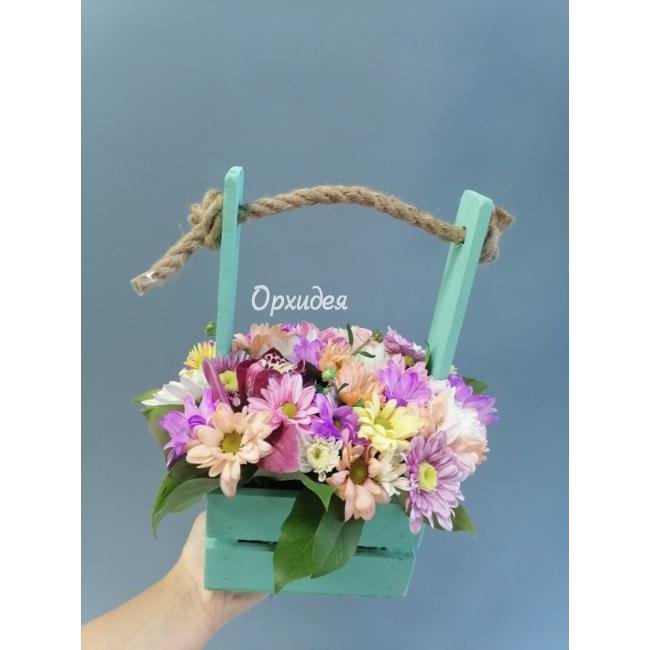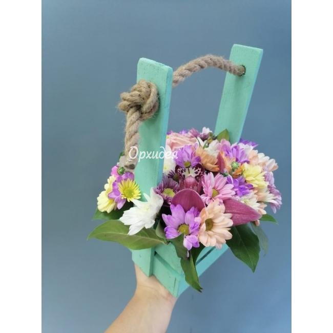 Описание Композиция с цветами в ящичке