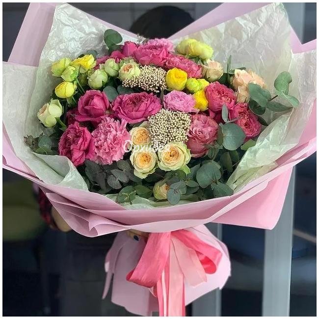 Каждая изготавливаемая флористом цветочная композиция является уникальной и может отличаться внешним видом, размером и оттенками цвета. Также возможны замены по ассортименту и составу цветов в зависимости от сезонности, наличия цветов и т.п. факторов. Итоговое исполнение заказа может незначительно отличаться от иллюстрации на сайте. При этом каждая цветочная композиция составляется из свежих цветов, и флористы предпринимают все усилия для того, чтобы цвет, форма цветочной работы как можно полнее соответствовали иллюстрации на сайте.