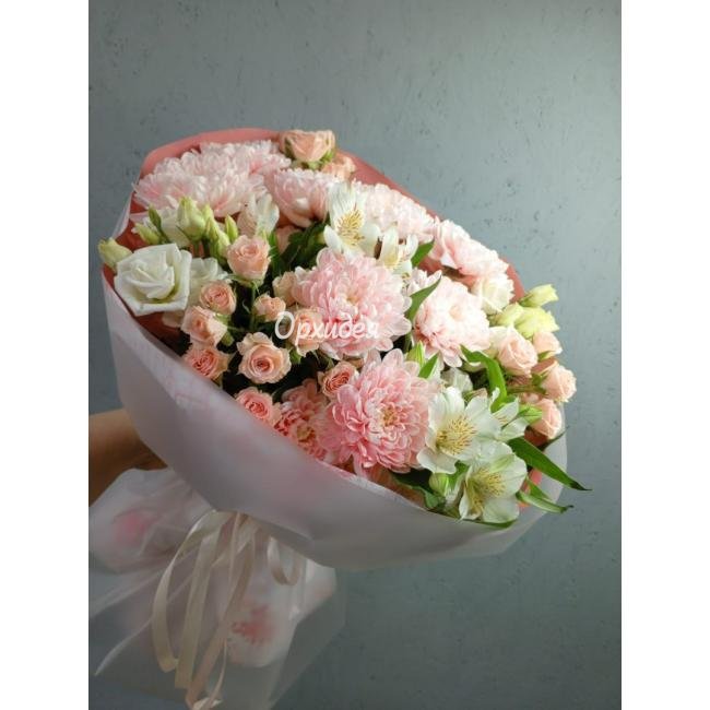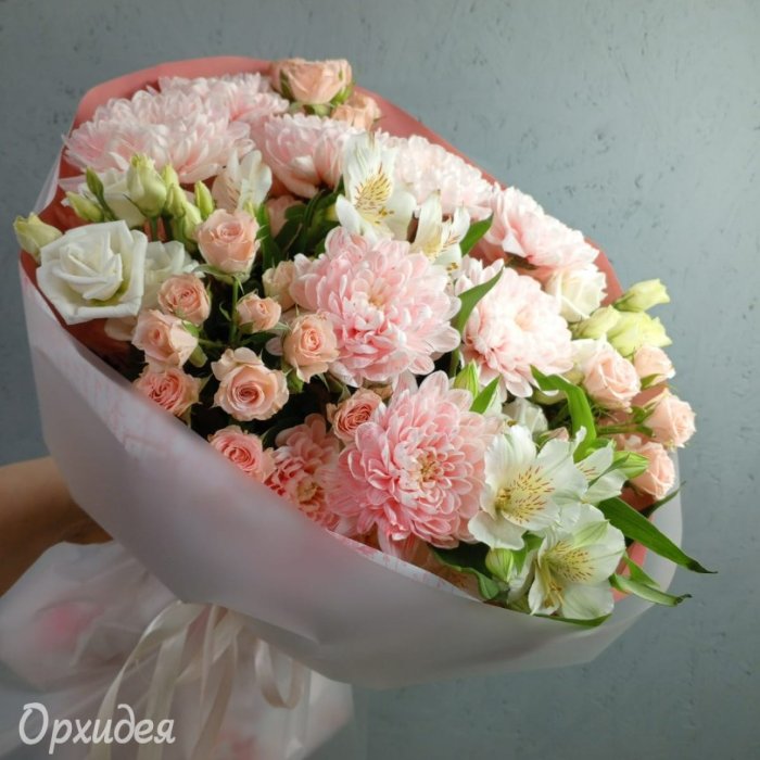 Каждая изготавливаемая флористом цветочная композиция является уникальной и может отличаться внешним видом, размером и оттенками цвета. Также возможны замены по ассортименту и составу цветов в зависимости от сезонности, наличия цветов и т.п. факторов. Итоговое исполнение заказа может незначительно отличаться от иллюстрации на сайте. При этом каждая цветочная композиция составляется из свежих цветов, и флористы предпринимают все усилия для того, чтобы цвет, форма цветочной работы как можно полнее соответствовали иллюстрации на сайте.