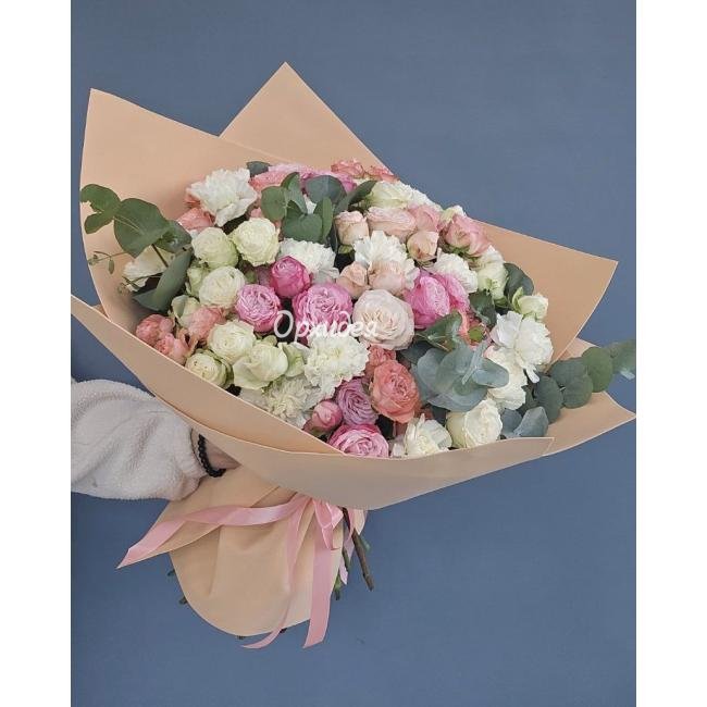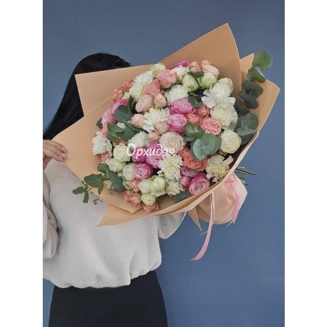 Каждая изготавливаемая флористом цветочная композиция является уникальной и может отличаться внешним видом, размером и оттенками цвета. Также возможны замены по ассортименту и составу цветов в зависимости от сезонности, наличия цветов и т.п. факторов. Итоговое исполнение заказа может незначительно отличаться от иллюстрации на сайте. При этом каждая цветочная композиция составляется из свежих цветов, и флористы предпринимают все усилия для того, чтобы цвет, форма цветочной работы как можно полнее соответствовали иллюстрации на сайте.