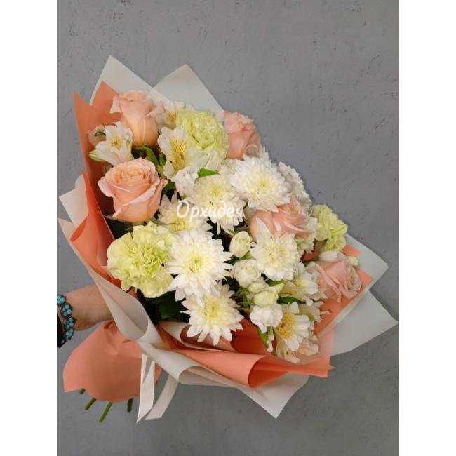 Каждая изготавливаемая флористом цветочная композиция является уникальной и может отличаться внешним видом, размером и оттенками цвета. Также возможны замены по ассортименту и составу цветов в зависимости от сезонности, наличия цветов и т.п. факторов. Итоговое исполнение заказа может незначительно отличаться от иллюстрации на сайте. При этом каждая цветочная композиция составляется из свежих цветов, и флористы предпринимают все усилия для того, чтобы цвет, форма цветочной работы как можно полнее соответствовали иллюстрации на сайте.