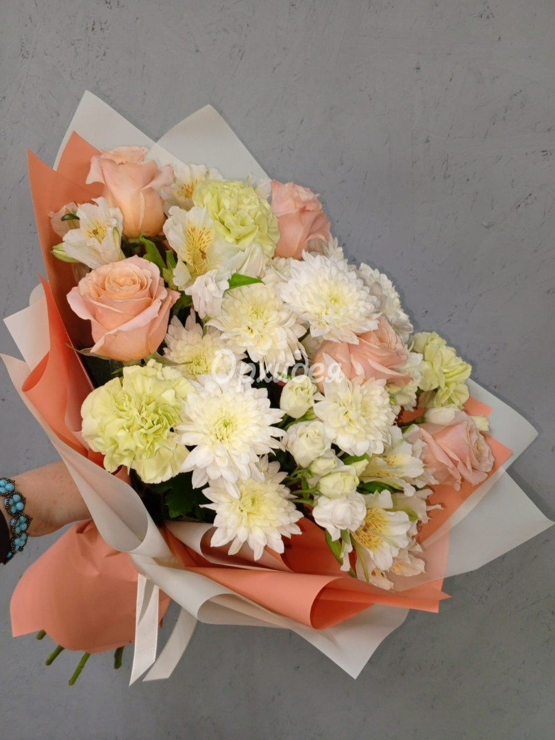 Каждая изготавливаемая флористом цветочная композиция является уникальной и может отличаться внешним видом, размером и оттенками цвета. Также возможны замены по ассортименту и составу цветов в зависимости от сезонности, наличия цветов и т.п. факторов. Итоговое исполнение заказа может незначительно отличаться от иллюстрации на сайте. При этом каждая цветочная композиция составляется из свежих цветов, и флористы предпринимают все усилия для того, чтобы цвет, форма цветочной работы как можно полнее соответствовали иллюстрации на сайте.